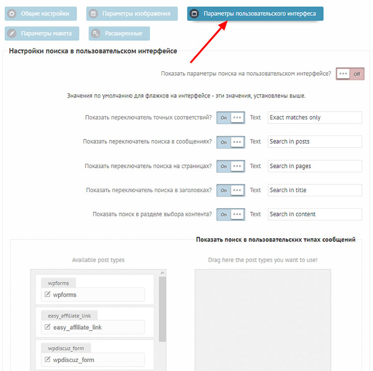 Следующая опция, позволяет выбрать в каких типах записей будет производиться поиск. Я установил только записи и страницы. Если вы установите рубрики, теги и прочие таксономии, то в результатах будут появляться повторы, только с разных страниц. Если же вы устанавливаете умный поиск для интернет-магазина, тогда конечно же, вам придётся выбрать соответствующие типы записей.