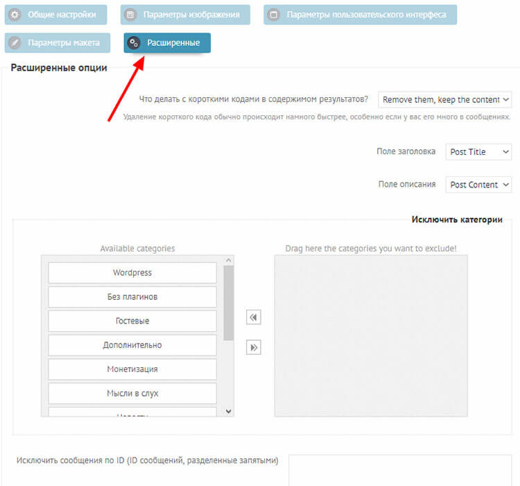 Тут вы можете настроить, что делать с шорткодами в результатах поиска, удалять ненужные категории и исключать из результатов определённые страницы на сайте.