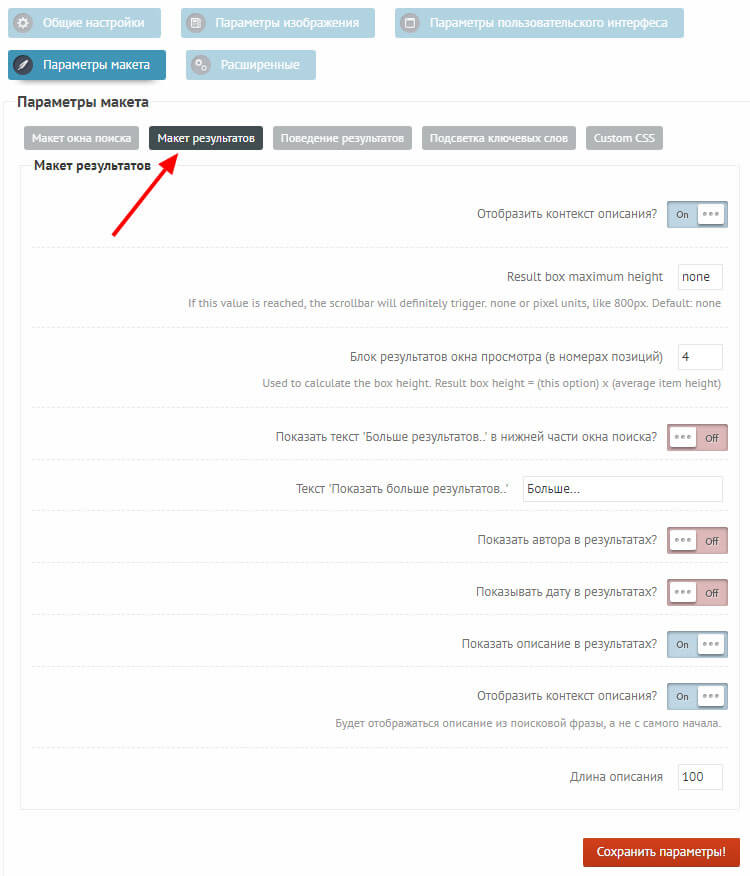 В этом разделе задается вывод превью в блоке поиска. То есть, будут показываться не только заголовки и краткое описание, но и превьюшка. С одной стороны, это эстетично, красиво. С другой стороны, поиск будет более долгим. Конечно, вы особой разницы не заметите, но вот ваш сервер точно почувствует если посещаемость на сайте будет высокая. Просто, имейте это ввиду.